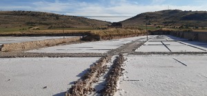 Ce cinquième jour promet une longue étape de 145 km, avec 1500 mètres de dénivelé. Je suis confiant au départ, car mon vélo a été remis en état, je me suis reposé la veille et le parcours est globalement descendant sur les 100 premiers kilomètres. Je quitte Medinaceli par une descente raide de 7 km, dans la fraîcheur matinale. Nous sommes à 1600 mètres d’altitude, et cette sensation de fraîcheur est agréable. N’ayant pas eu le temps de prendre le petit-déjeuner à notre “casa rurale” à Medinaceli, je m’arrête au premier bar que je rencontre. Je longe les salines de Medinaceli. Le tenancier du bar m’explique que le sel y est encore exploité. De vastes étendues sont exposées au soleil. Ce sel sert principalement aux fêtes de village (pour jeter sur les mariés, sans doute) et à protéger les routes en hiver, car il gèle fréquemment dans la région. Il s’agit donc d’un sel industriel, et non alimentaire.