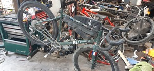 Heureusement, il s’occupe de moi. Il a deux pneus pour mon vélo : un pneu gravel de 35 mm et un de 42 mm. Le reste est constitué de pneus VTT ou route. Il me propose d’essayer le pneu de 42 mm, bien que mon vélo soit conçu pour des pneus de 40 mm maximum. Il essaie de monter le pneu, mais il ne tient pas. Le fond de jante est mort, bien qu’il soit récent (un mois). Il me dit : “Pas grave, on va le changer”. Il remplace le fond de jante, installe le nouveau pneu, met du liquide anticrevaison et révise mon vélo. Une heure et demie plus tard, à midi, mon vélo est prêt à repartir.