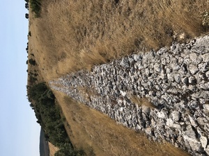 Sur mon GPS, j’avais enregistré plusieurs points d’intérêt : sites à visiter et monuments en hommage au Cid. La route serpente à travers des vallées, des champs de blé et de tournesols. J’ai croisé d’immenses réserves de chasse privées, clôturées et surveillées par des caméras. Autour d’une de ces zones de chasse, en descendant une côte, debout sur les pédales, ma roue avant s’est enfoncée dans un trou et mon guidon a basculé brusquement vers l’avant, se desserrant complètement. Je me suis arrêté sans dommage, mais mon guidon était trop bas. J’ai tenté de réparer avec mes outils, mais ma clé Allen était trop courte pour atteindre les vis. Je suis reparti prudemment et, dans le village de Cubillo del Campo, j’ai sollicité l’aide de deux villageois assis sur un banc, mais aucun n’avait l’outil adéquat… J’ai dû continuer en me disant que je réparerais plus tard. Pour le moment je dois franchir un col à 1300 m avec, quelle surprise là-haut, gravée dans la montagne, une immense épée du Cid, réalisée en pierres ! Un chemin dessine la lame, avec l’inscription “Cid” à l’extrémité. La photo est difficile à prendre, mais c’est un spectacle extraordinaire que l’on voit de très loin.