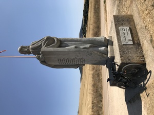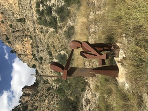 Après cette longue descente, je repars sur des pistes plus techniques, avec une autre ascension en pleine chaleur de midi pour atteindre 1705 mètres d’altitude au Puerto de Villa Rosario, du côté de Bronchales. C’est compliqué. Après Albarracín, dans une clairière, je suis intrigué par une statue en fer. Je freine, fais demi-tour et regarde. Il s’agit d’une sculpture en hommage à une fusillade qui a eu lieu durant la guerre d’Espagne en 1936. Le 16 septembre 1936, l’armée franquiste a fusillé des habitants locaux. La sculpture, pleine d’émotion, est placée dans un endroit isolé. Difficile de s’arrêter en voiture et de se recueillir. C’est symbolique de l’Espagne actuelle. La question de construire un musée en l’honneur de la guerre d’Espagne est débattue depuis des années, mais rien n’a été fait. Il faudrait que je revienne à Teruel pour visiter ces lieux, car ce fut un haut lieu de la guerre d’Espagne, entre 1936 et 1939.