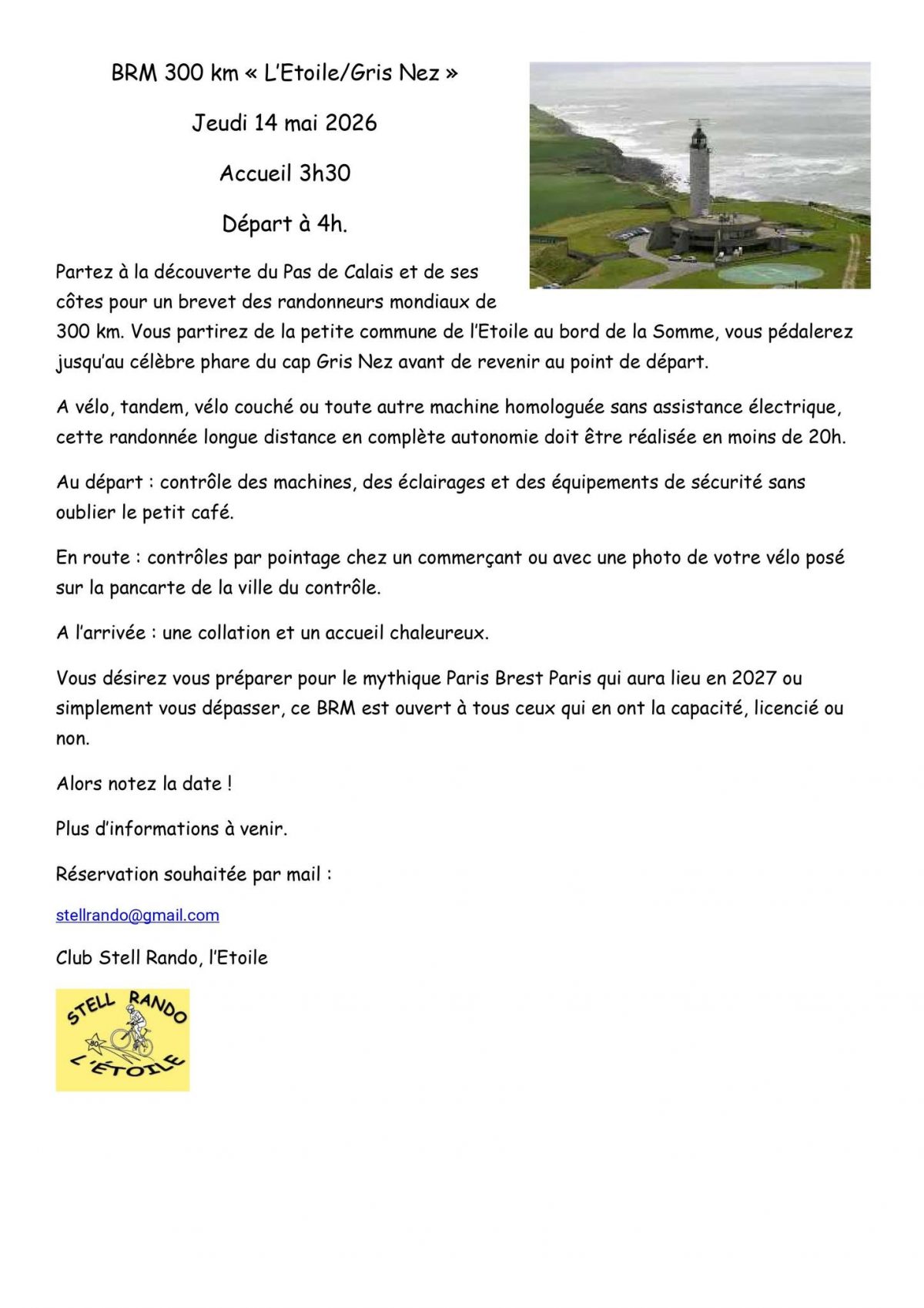 BRM 300 L’Étoile – Cap Gris Nez Quand jeu 14/05/2026 00:00 Ajouter au Calendrier Télécharger ICS Calendrier Google iCalendar Office 365 Outlook Live Type d’évènement Brevets des Randonneurs Mondiaux (BRM) Cyclotourisme Route Parcours Facebook